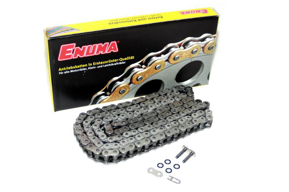 Die Motorradketten aus dem Hause Enuma stehen für ausgezeichnete Qualität und Leichtlaufeigenschaften. So sorgen Enuma-Kettensätze auch im Rennsportbereich seit Jahren für enorme Zugfestigigkeit bei höchsten Belastungen und geringem Verschleiß dank reduzierter Reibung.