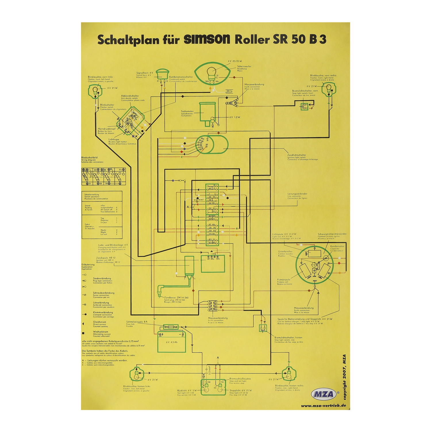 Der farbig gedruckte Schaltplan SR50 B3 Großformat ist ein professioneller Ersatz-Schaltplan für den elektrischen Aufbau deines Simson SR50 B3-Rollers. In großem Format (400 × 570 mm) und mit farblich hervorgehobenen Leitungen und Komponenten zeigt dieser Plan die komplette 6 Volt-Elektrik deines Fahrzeugs übersichtlich und verständlich. Ideal geeignet für Fehlersuche, Wartung oder Reparatur der gesamten Bordelektrik – vom Licht über Zündanlage bis zum Kabelbaum. Durch seine robuste Ausführung und die klare Struktur ist dieser Plan ein unverzichtbares Hilfsmittel für Hobby-Schrauber, Werkstätten und Sammler klassischer Simson-Modelle.