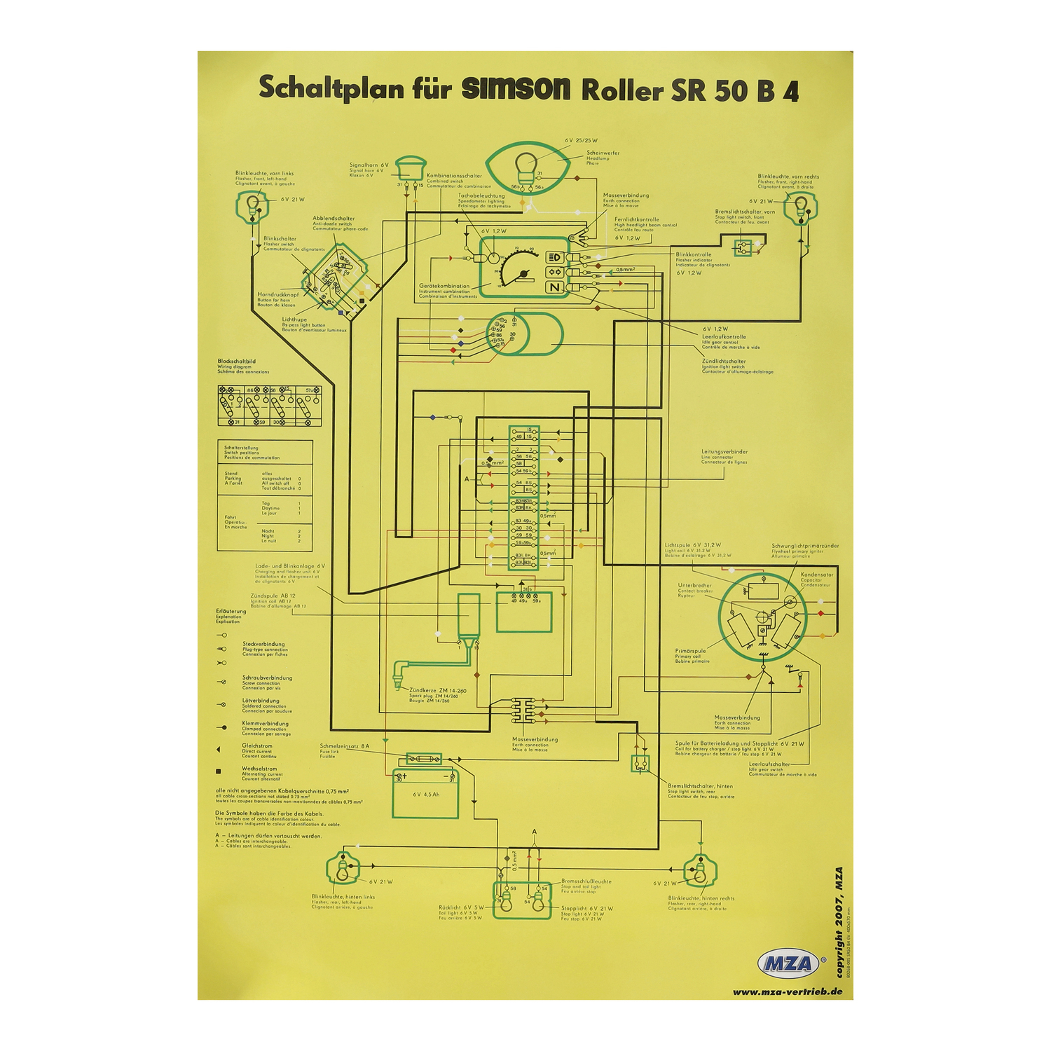 Der farbig gedruckte Schaltplan SR50 B4 Großformat ist ein hochwertiger, detaillierter Ersatz-Schaltplan für die elektrische Anlage ihres Simson SR 50 B4-Rollers im klassischen 6-Volt-System. Mit seinen großzügigen Abmessungen von 400 × 570 mm bietet dieser Großformat-Plan eine klare, leicht verständliche Darstellung aller Kabel, Verbindungen und elektrischen Komponenten – ideal für Fehlersuche, Wartung, Reparatur oder Restaurationsarbeiten. Die farbige Darstellung erleichtert das Zuordnen von Leitungen und Bauteilen erheblich, was sowohl Hobby-Schrauber als auch professionelle Werkstätten schätzen. Ein robustes, praxisorientiertes Hilfsmittel, das in keiner Werkstatt fehlen sollte.