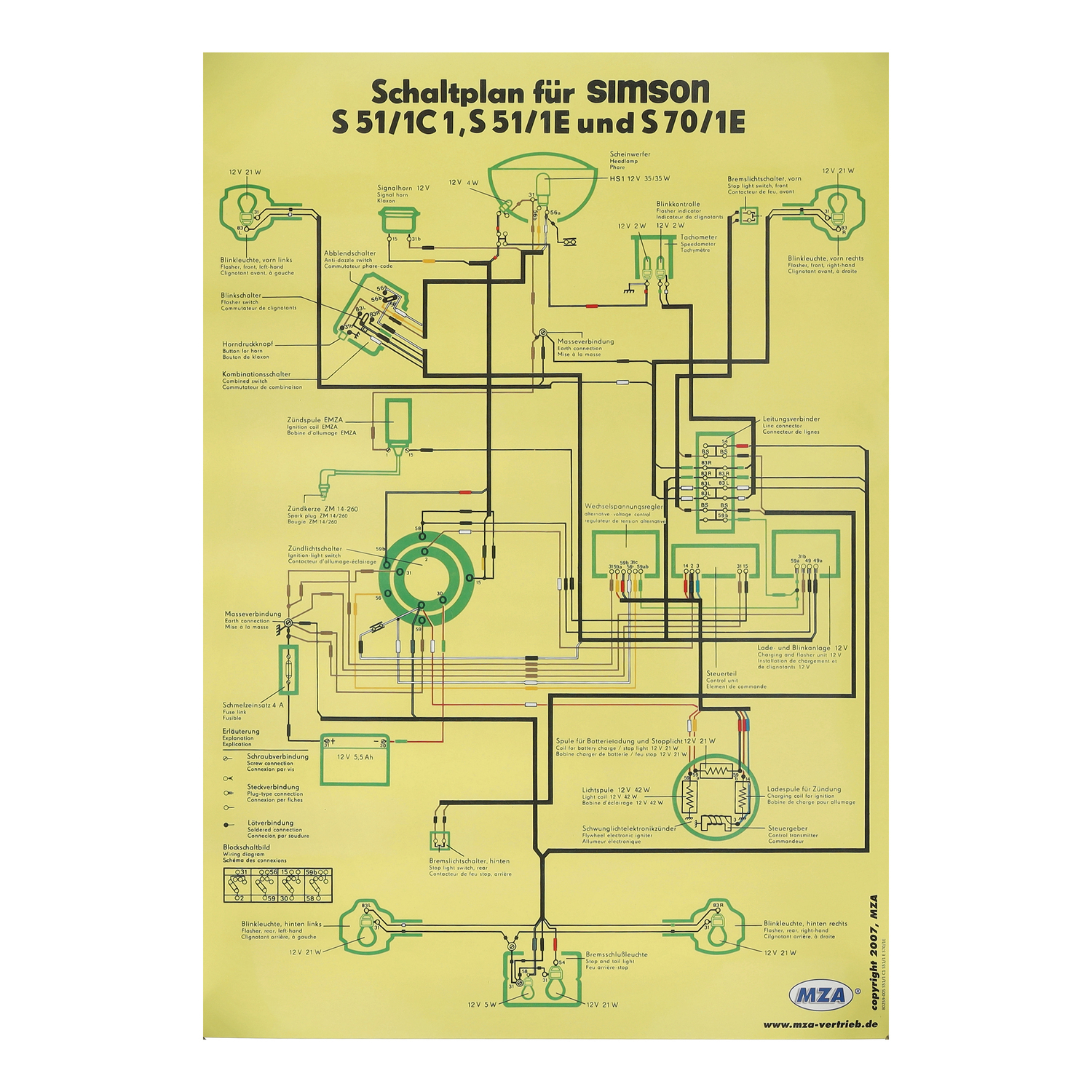 Der Schaltplan S51/1C1 S51/1E S70/1E Großformat ist die ideale Hilfe, wenn Sie die Fahrzeugelektrik Ihrer Simson schnell, sicher und nachvollziehbar prüfen oder neu aufbauen möchten. Das farbige Schaltbild im großzügigen Format 400 × 600 mm bietet Ihnen eine besonders übersichtliche Darstellung aller relevanten Stromkreise, Leitungswege und Anschlussstellen. Dadurch finden Sie Fehlerquellen bei der Diagnose deutlich schneller und reduzieren das Risiko von Verdrahtungsfehlern bei Reparatur- oder Restaurationsarbeiten.